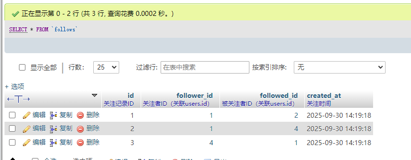 CREATE TABLE `follows` ( `id` INT UNSIGNED NOT NULL AUTO_INCREMENT COMMENT '关注记录ID', `follower_id` INT UNSIGNED NOT NULL COMMENT '关注者ID(关联users.id)', `followed_id` INT UNSIGNED NOT NULL COMMENT '被关注者ID(关联users.id)', `created_at` DATETIME NOT NULL DEFAULT CURRENT_TIMESTAMP COMMENT '关注时间', PRIMARY KEY (`id`), -- 联合唯一索引:防止重复关注 UNIQUE KEY `uk_follow_relation` (`follower_id`, `followed_id`), -- 外键约束:确保关联的用户存在 CONSTRAINT `fk_follower` FOREIGN KEY (`follower_id`) REFERENCES `users` (`id`) ON DELETE CASCADE, CONSTRAINT `fk_followed` FOREIGN KEY (`followed_id`) REFERENCES `users` (`id`) ON DELETE CASCADE ) ENGINE=InnoDB DEFAULT CHARSET=utf8mb4 COMMENT='关注关系表';
