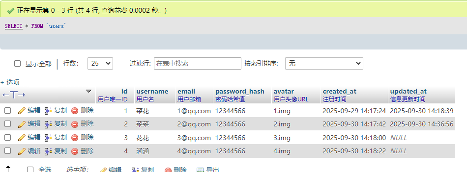 CREATE TABLE `users` ( `id` INT UNSIGNED NOT NULL AUTO_INCREMENT COMMENT '用户唯一ID', `username` VARCHAR(50) NOT NULL COMMENT '用户名', `email` VARCHAR(100) NOT NULL COMMENT '用户邮箱', `password_hash` VARCHAR(255) NOT NULL COMMENT '密码哈希值', `avatar` VARCHAR(255) DEFAULT NULL COMMENT '用户头像URL', `created_at` DATETIME NOT NULL DEFAULT CURRENT_TIMESTAMP COMMENT '注册时间', `updated_at` TIMESTAMP DEFAULT NULL ON UPDATE CURRENT_TIMESTAMP COMMENT '信息更新时间', PRIMARY KEY (`id`), UNIQUE KEY `uk_username` (`username`), -- 用户名唯一索引 UNIQUE KEY `uk_email` (`email`) -- 邮箱唯一索引 ) ENGINE=InnoDB DEFAULT CHARSET=utf8mb4 COMMENT='用户表';